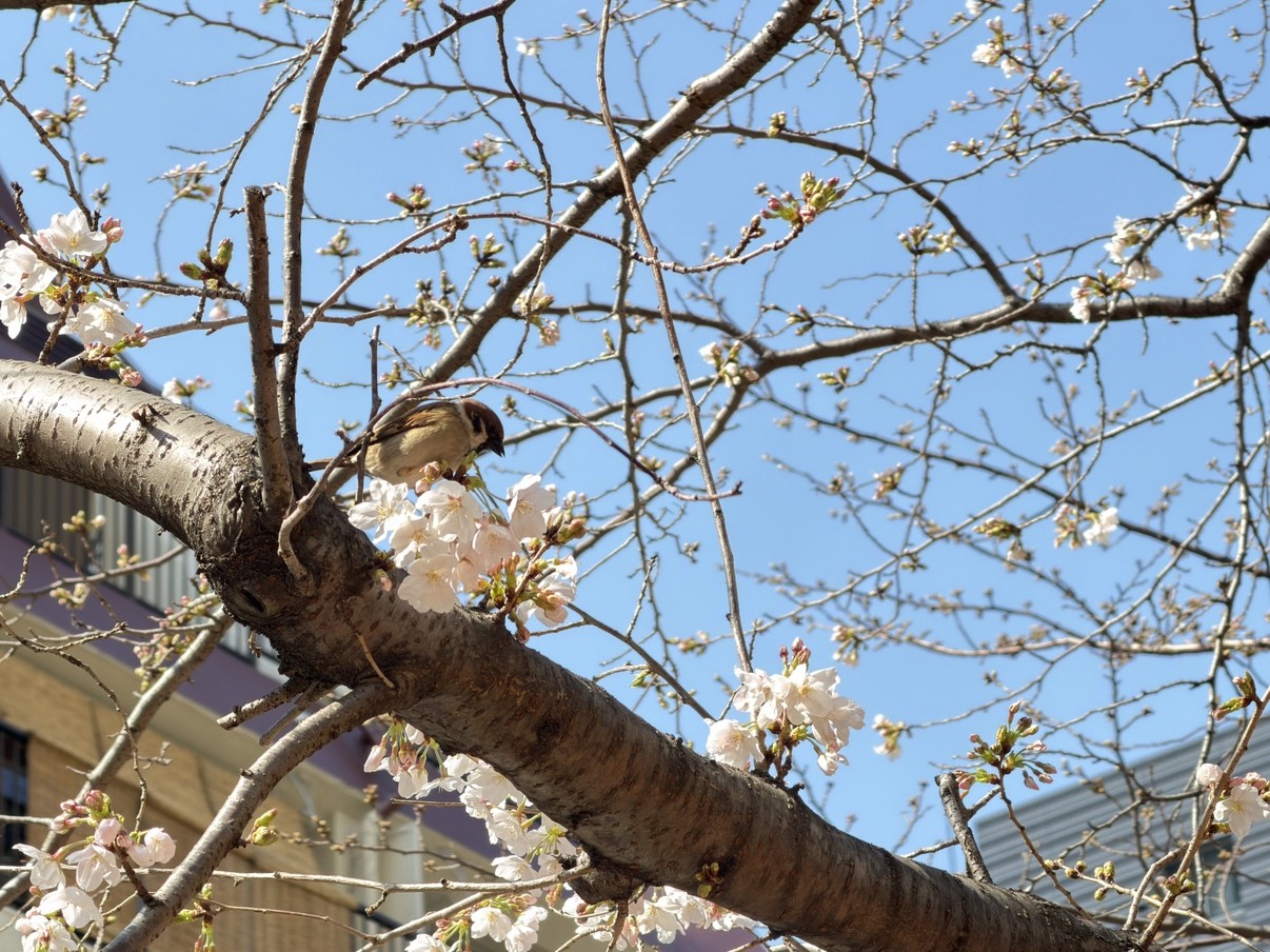 大通りで早々と咲いていた桜には花見をする雀の姿も見られました。