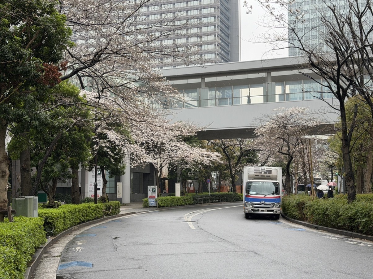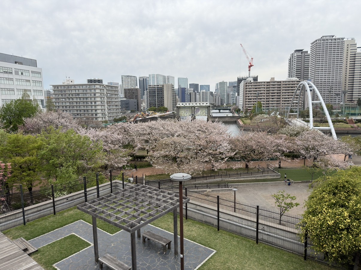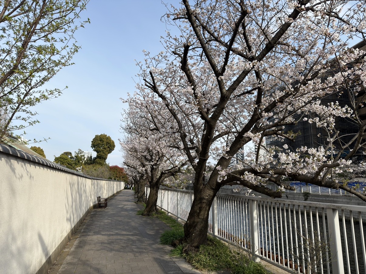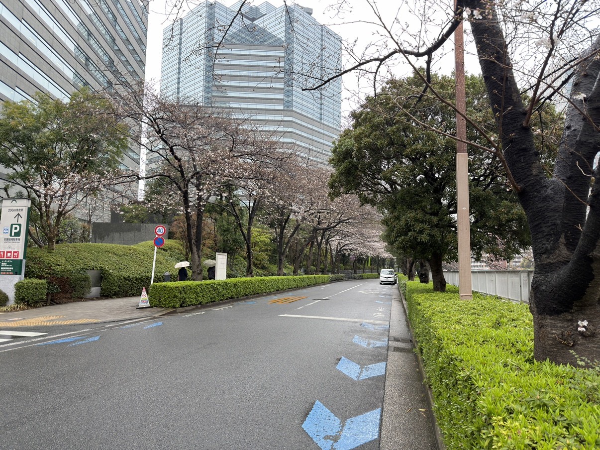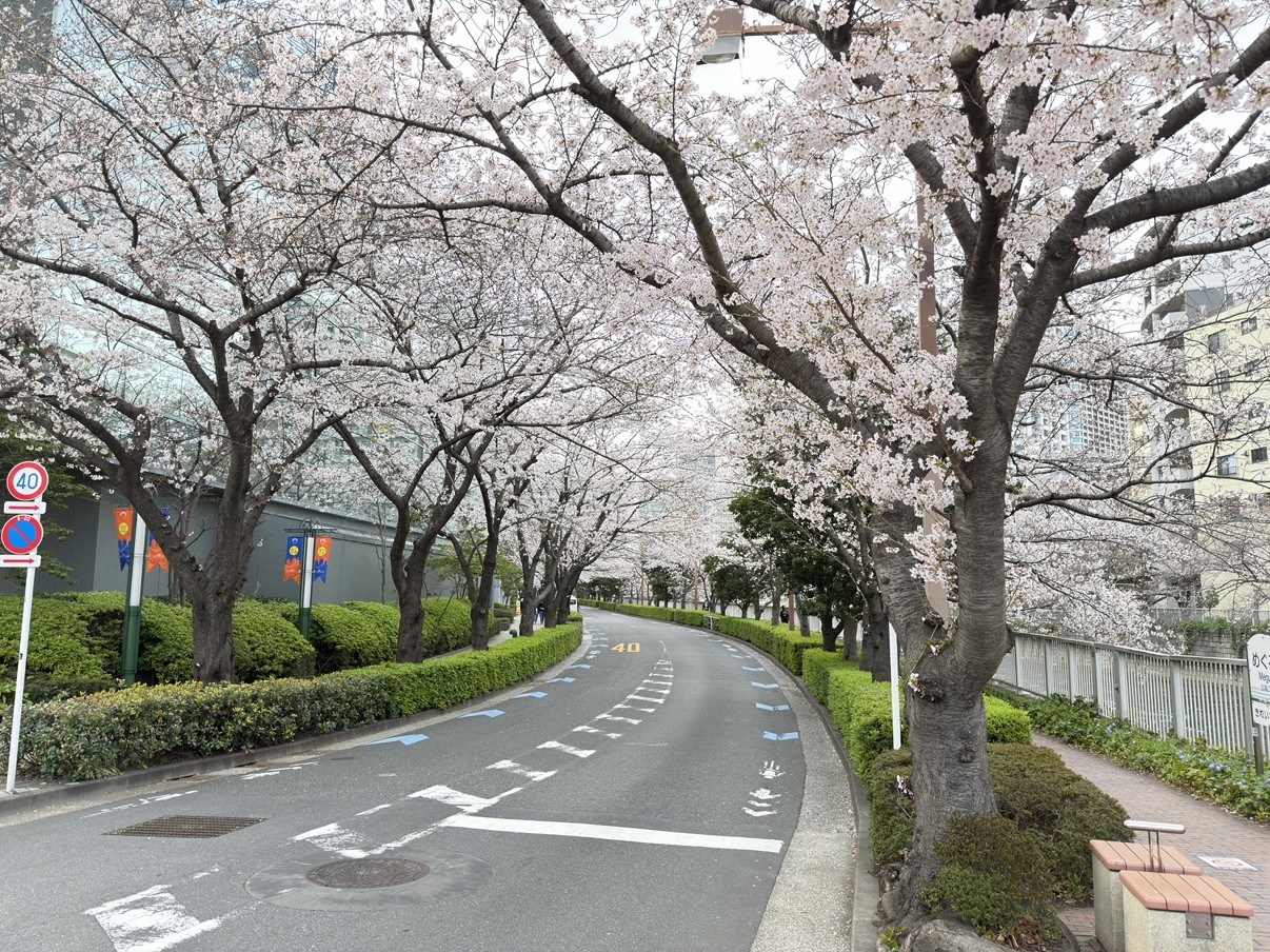 海沿いの天王洲まで来てみたところ、こちらにも立派な桜が多く立ち並んでいました。