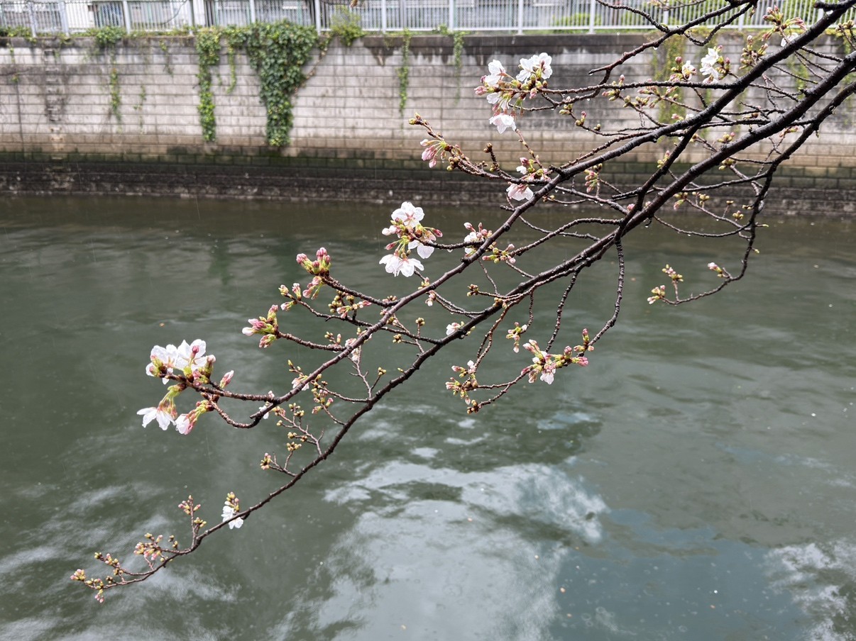 天気はあいにくの雨でしたが、目黒川沿いの桜も花を開かせ始めました。